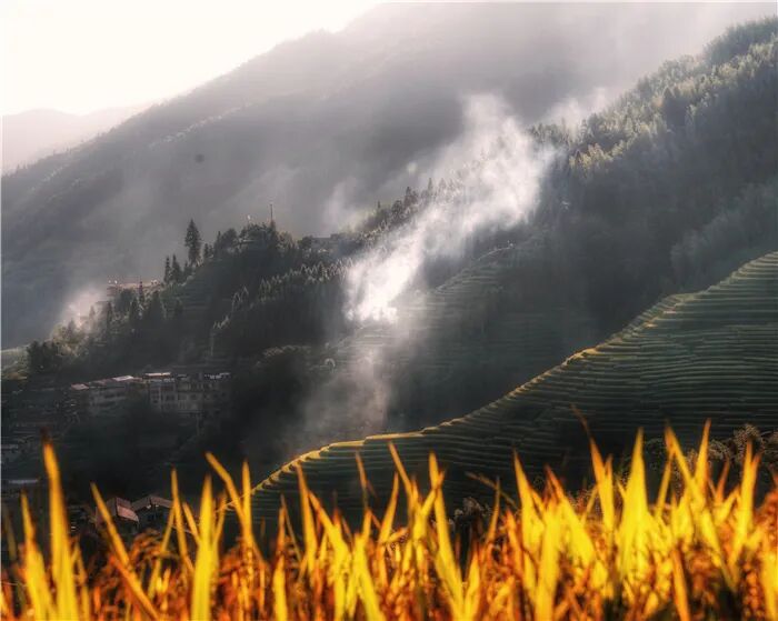 如天堂掉落在人间一般,童话般遥远而古老神秘,在一片片缥缈的洁白的云雾中,极目远眺,一座座大山上蜿蜒起伏的梯田,静如止水,精美绝伦。