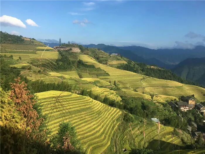 左右到达梯田景区售票处,可解决午餐,然后验票转乘景区中巴车上山,乘车约半个小时后到达龙脊梯田平安寨检票口,沿途观赏壮观梯田,约半个小时到达——【特色吊脚楼】,大家放下行李就可以跟着领队一起走上观景台赏梯田美景,或自己约伴出去逛逛了~
