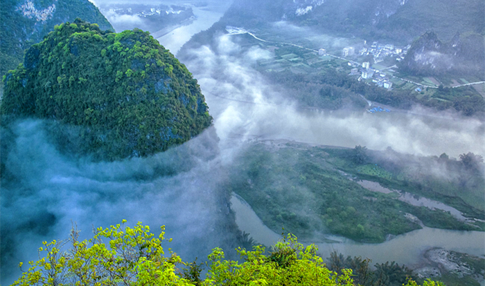 登上相公山举目远眺,群峰排列有序,清澈的漓江蜿蜒流淌在群山怀抱中。
